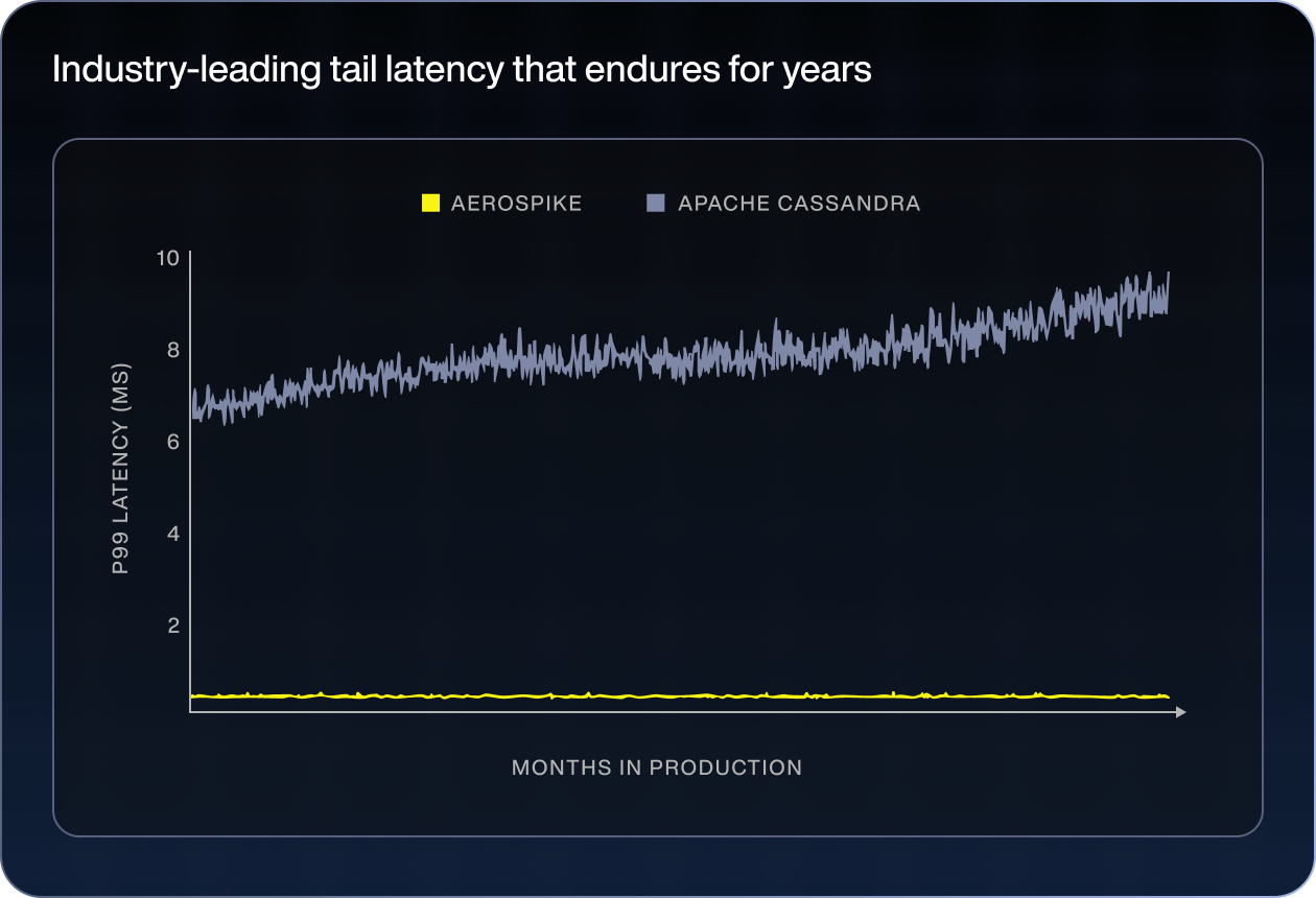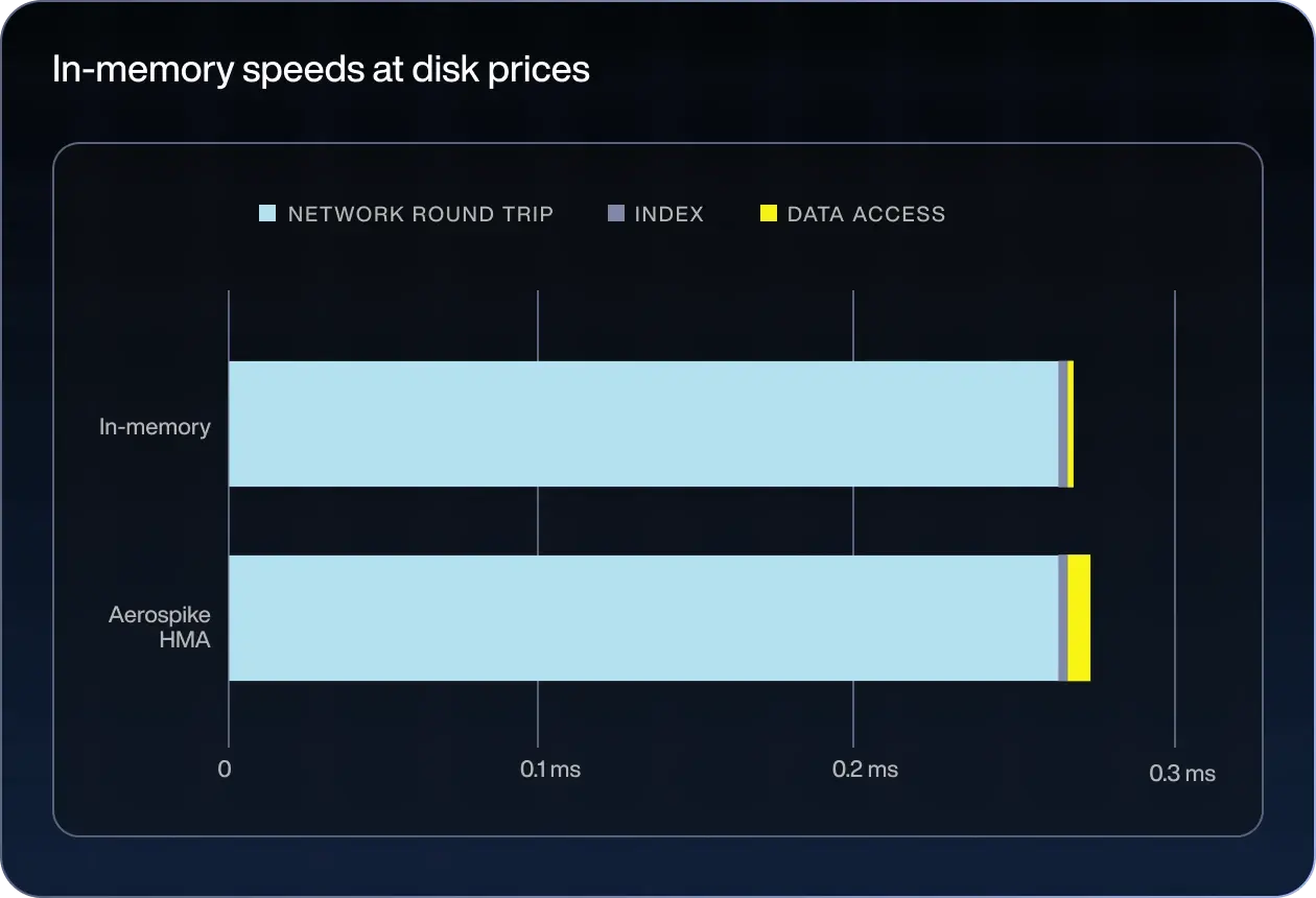 Aerospike’s patented Hybrid Memory Architecture delivers memory-like latency, with the durability and low cost of SSDs.